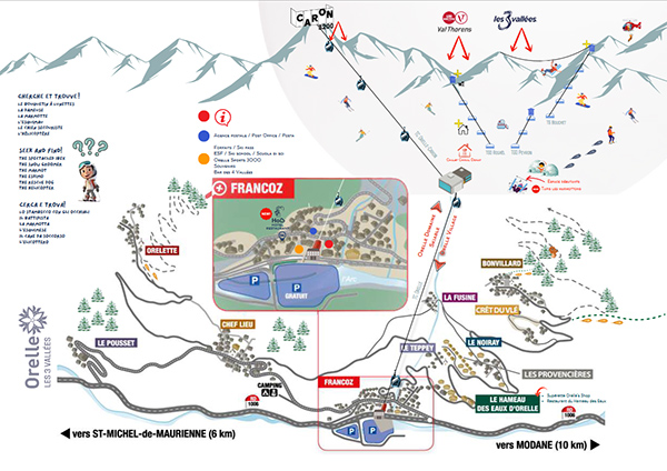 Orelette, le Poucet, le Chef Lieu, Francoz, Le hameau des Eaux d’Orelle, Le Teppey, Les Provencières, La Fusine, Le Crêt du Vlé et Bonvillard.
